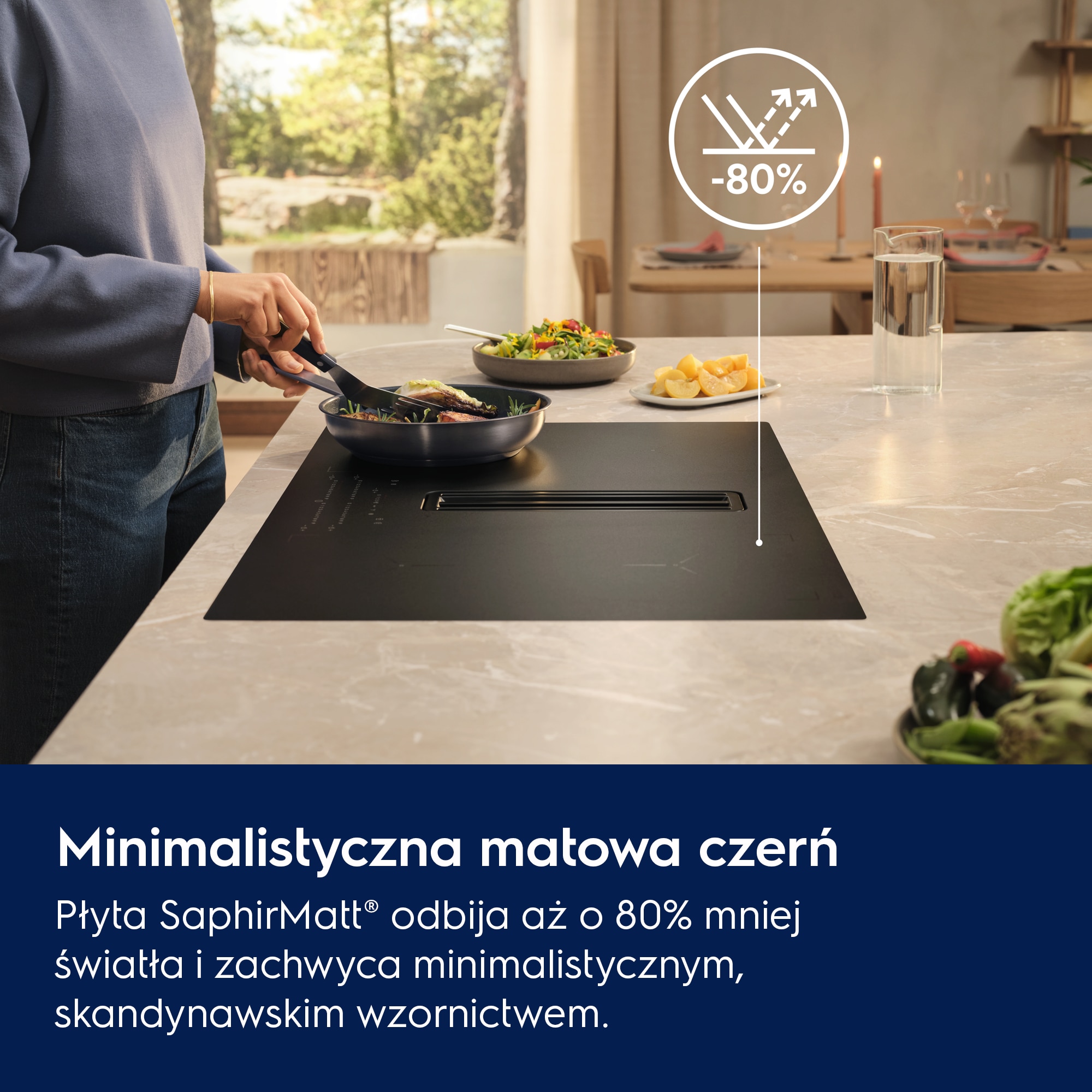 Czarna, matowa powierzchnia SaphirMatt® to synonim trwałej elegancji — 4 razy bardziej odporna na zarysowania niż standardowe szkło, odporna na odciski palców i plamy, co znacząco ułatwia utrzymanie czystości i sprawia, że płyta dłużej wygląda jak nowa.