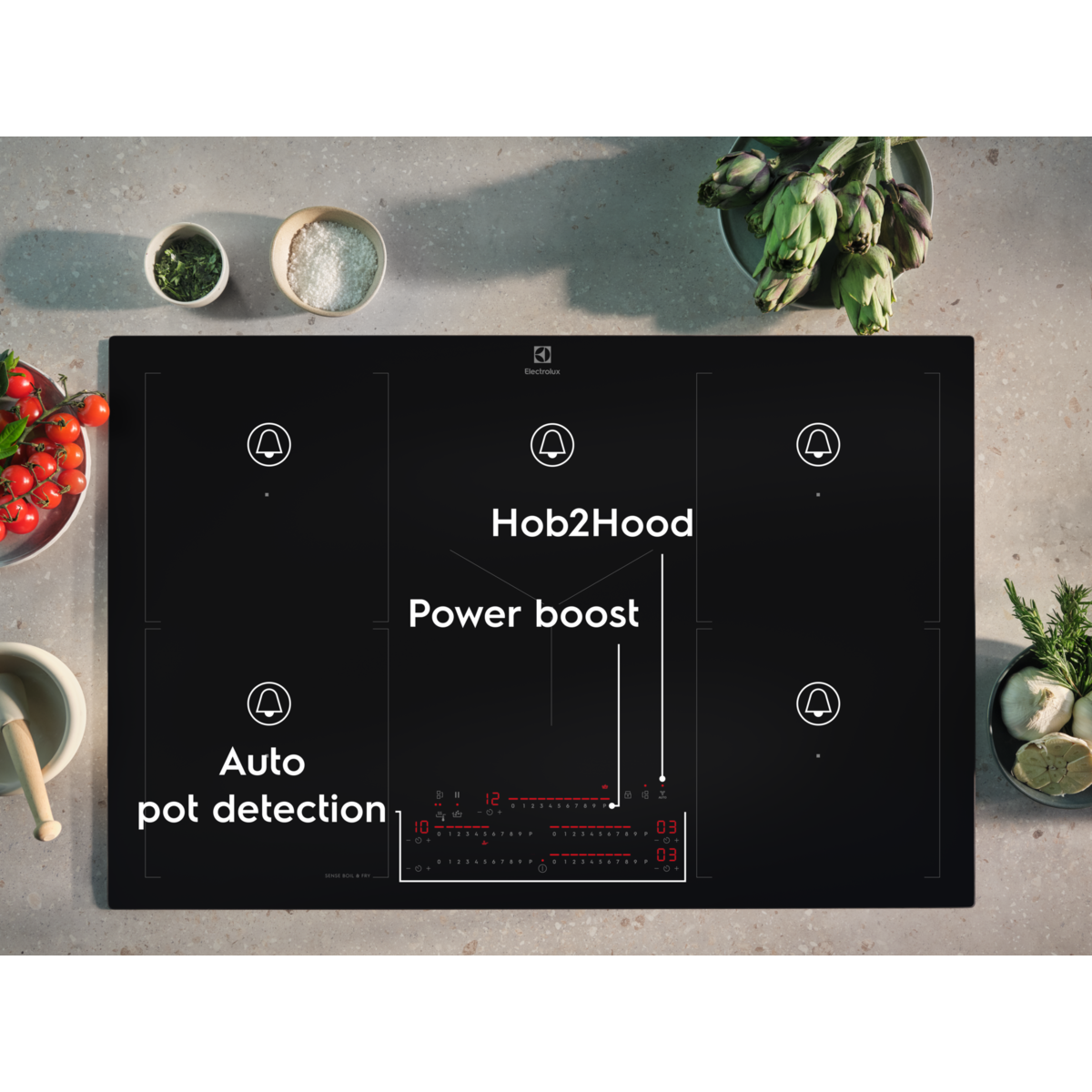 Płyta indukcyjna 700 SenseBoil SLIM-FIT EIS82550I z pięcioma strefami grzejnymi posiada czujnik SenseBoil, który kontroluje moment wrzenia wody i automatycznie dostosowuje moc, ułatwiając gotowanie i zwiększając bezpieczeństwo. Płyta posiada między innymi funkcje: PowerBoost, DoubleBridge oraz Hob2Hood®.