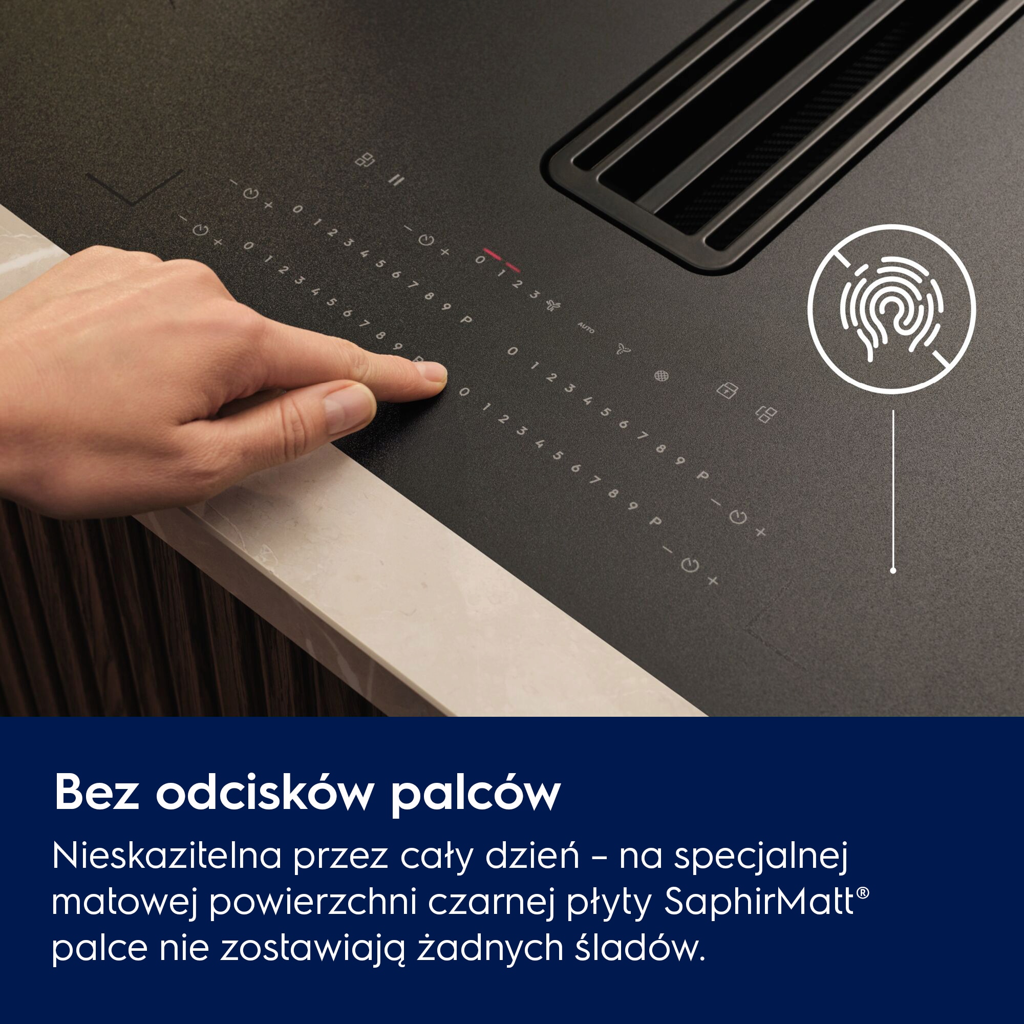 Czarna, matowa powierzchnia SaphirMatt® to synonim trwałej elegancji — 4 razy bardziej odporna na zarysowania niż standardowe szkło, odporna na odciski palców i plamy, co znacząco ułatwia utrzymanie czystości i sprawia, że płyta dłużej wygląda jak nowa.