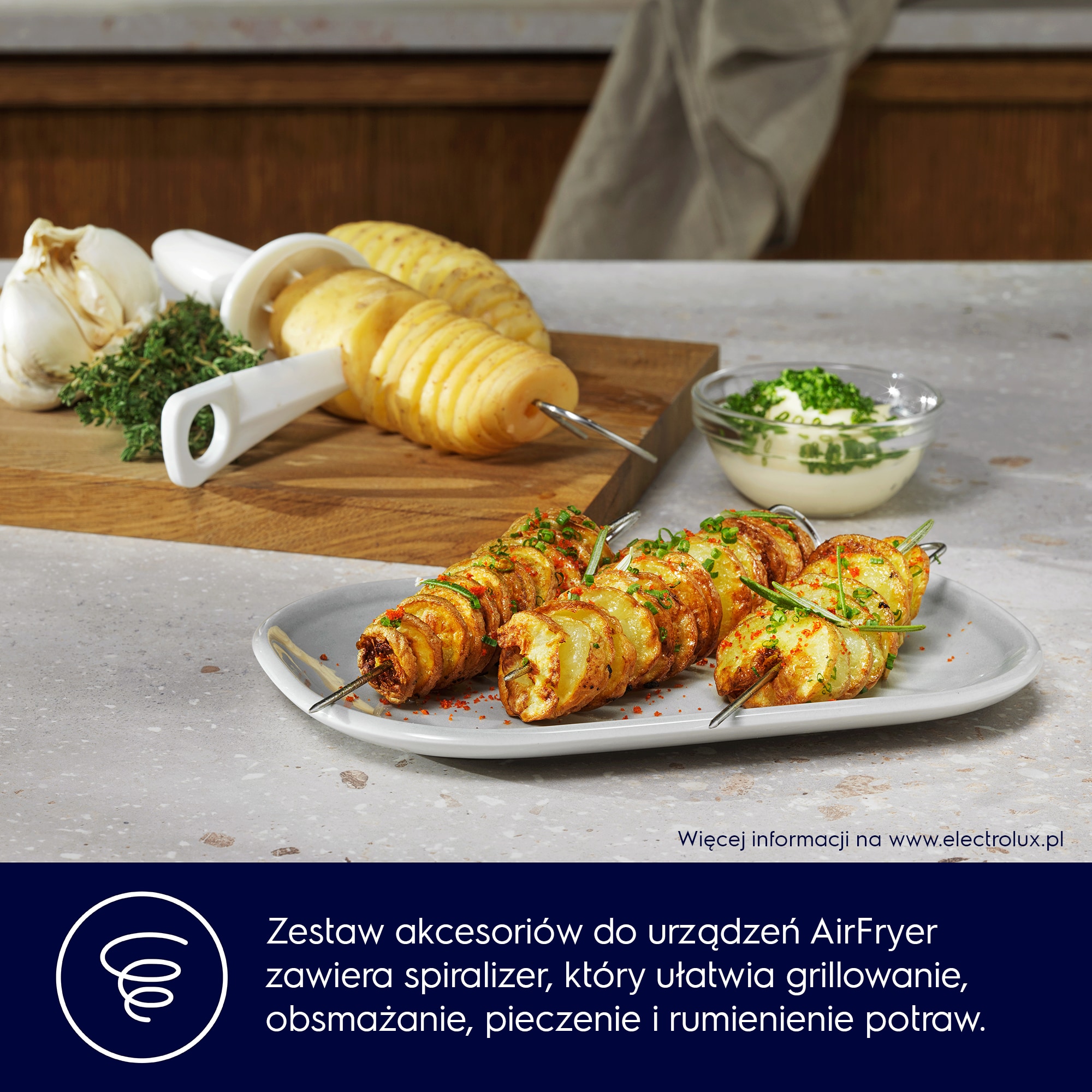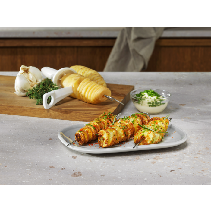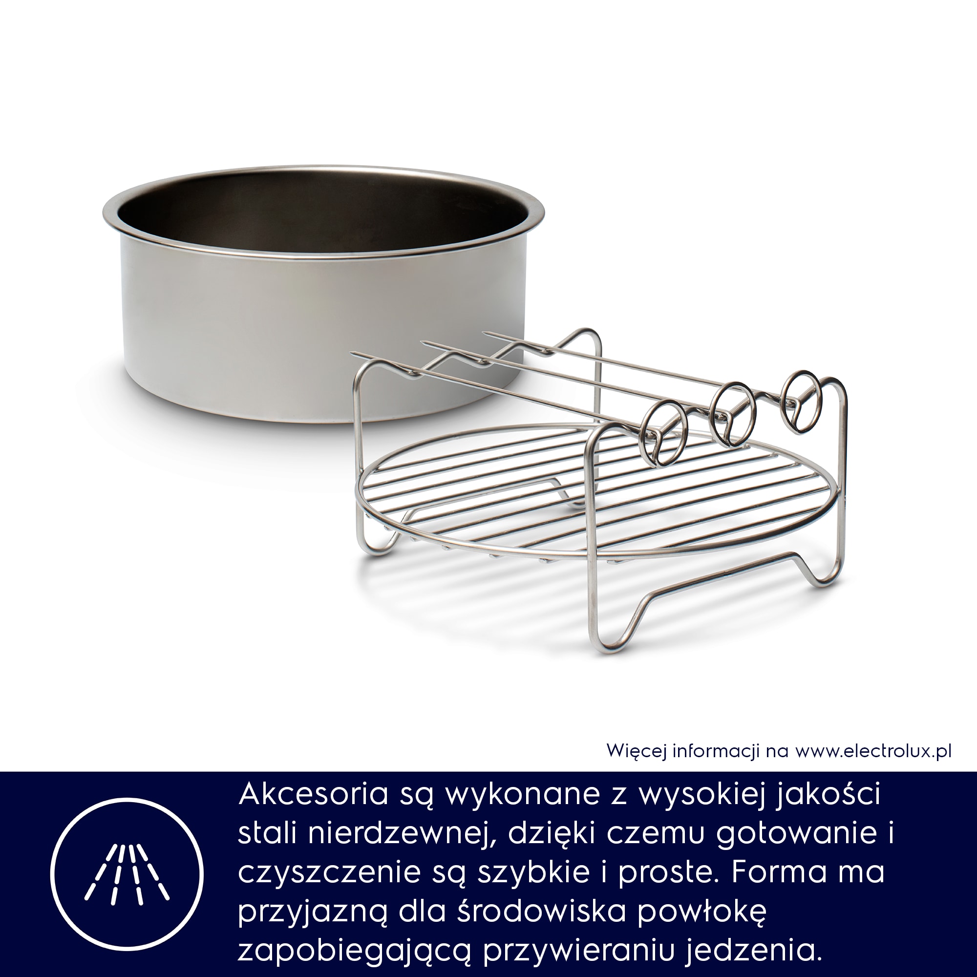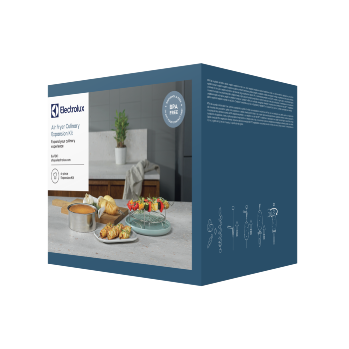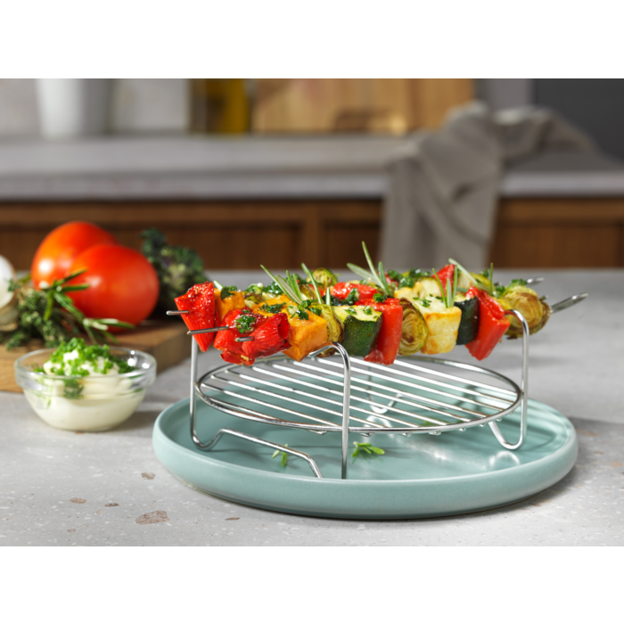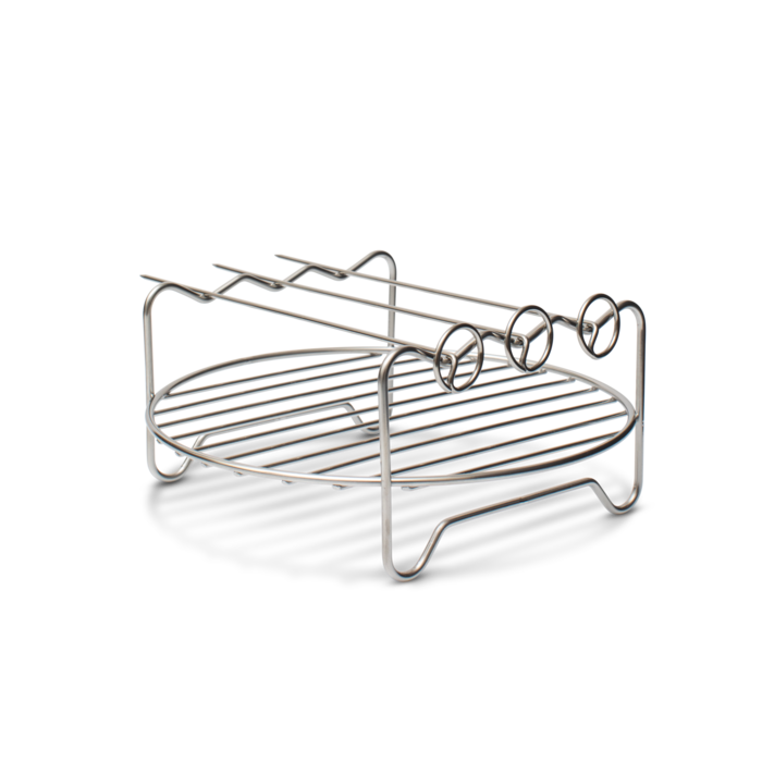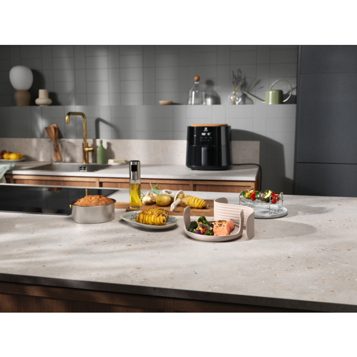 Sześcioczęściowy zestaw akcesoriów do frytkownicy beztłuszczowej, który zwiększa możliwości zdrowego gotowania. Zawiera formę do pieczenia, ruszt, szpikulce i spiralizer – wszystko wykonane z wysokiej jakości materiałów, łatwe w użyciu i czyszczeniu.
