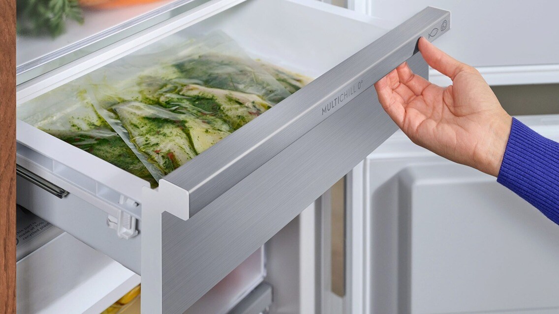 Odkryj nową jakość chłodzenia z szufladą MultiChill 0°C. Elegancki akcent w postaci szklanego panelu tylnego rozjaśnia wnętrze lodówki, a zaawansowany system cyrkulacji chłodnego powietrza przedłuża świeżość produktów. Szuflada została wykonana z tworzyw z recyklingu, w duchu zrównoważonego rozwoju. Odkryj wielofunkcyjną szufladę MultiChill 0°C i steruj nią wygodnie w aplikacji.