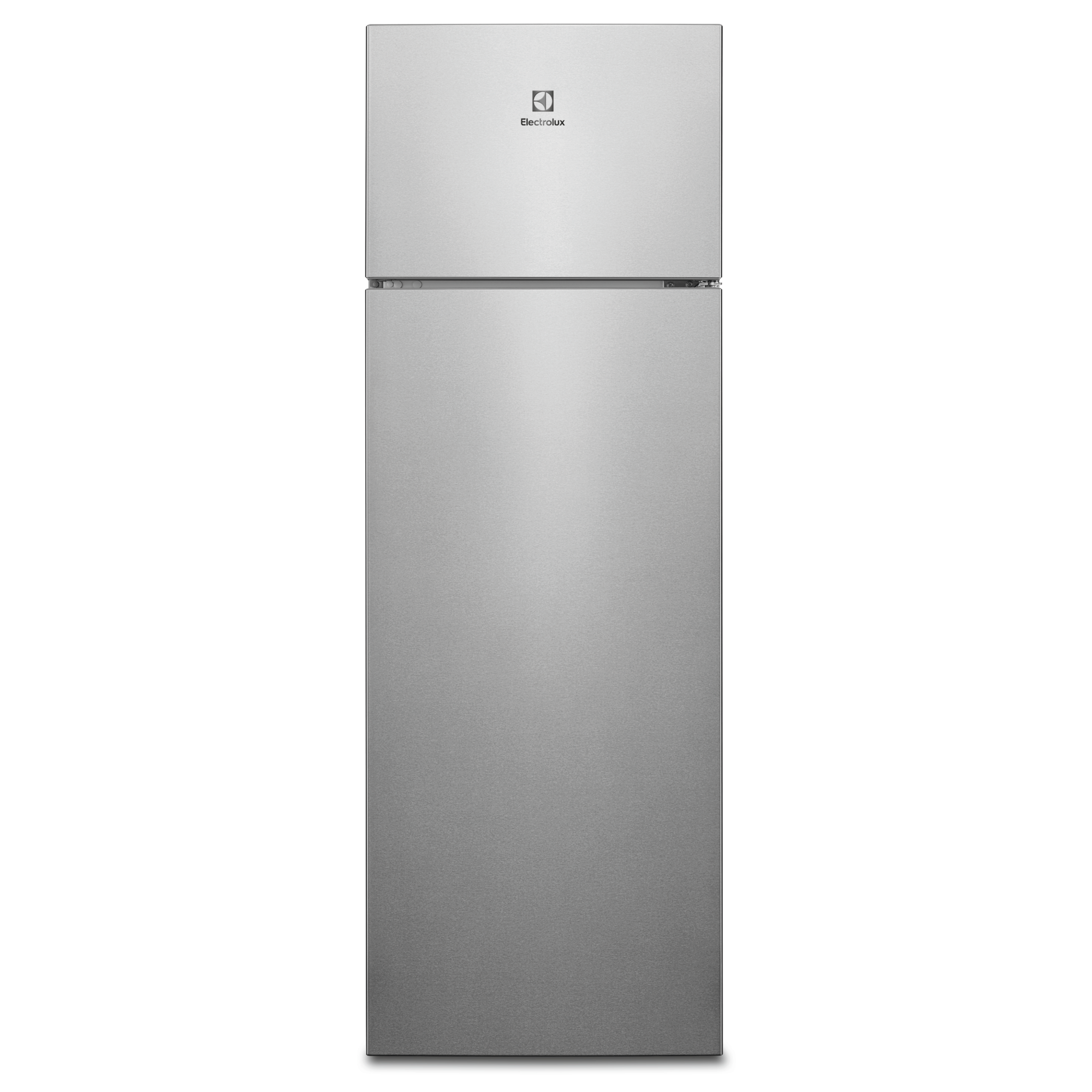 Lodówka z górnym zamrażalnikiem z technologią LowFrost, wyświetlaczem LDC i oświetleniem LED, kolor srebrny.