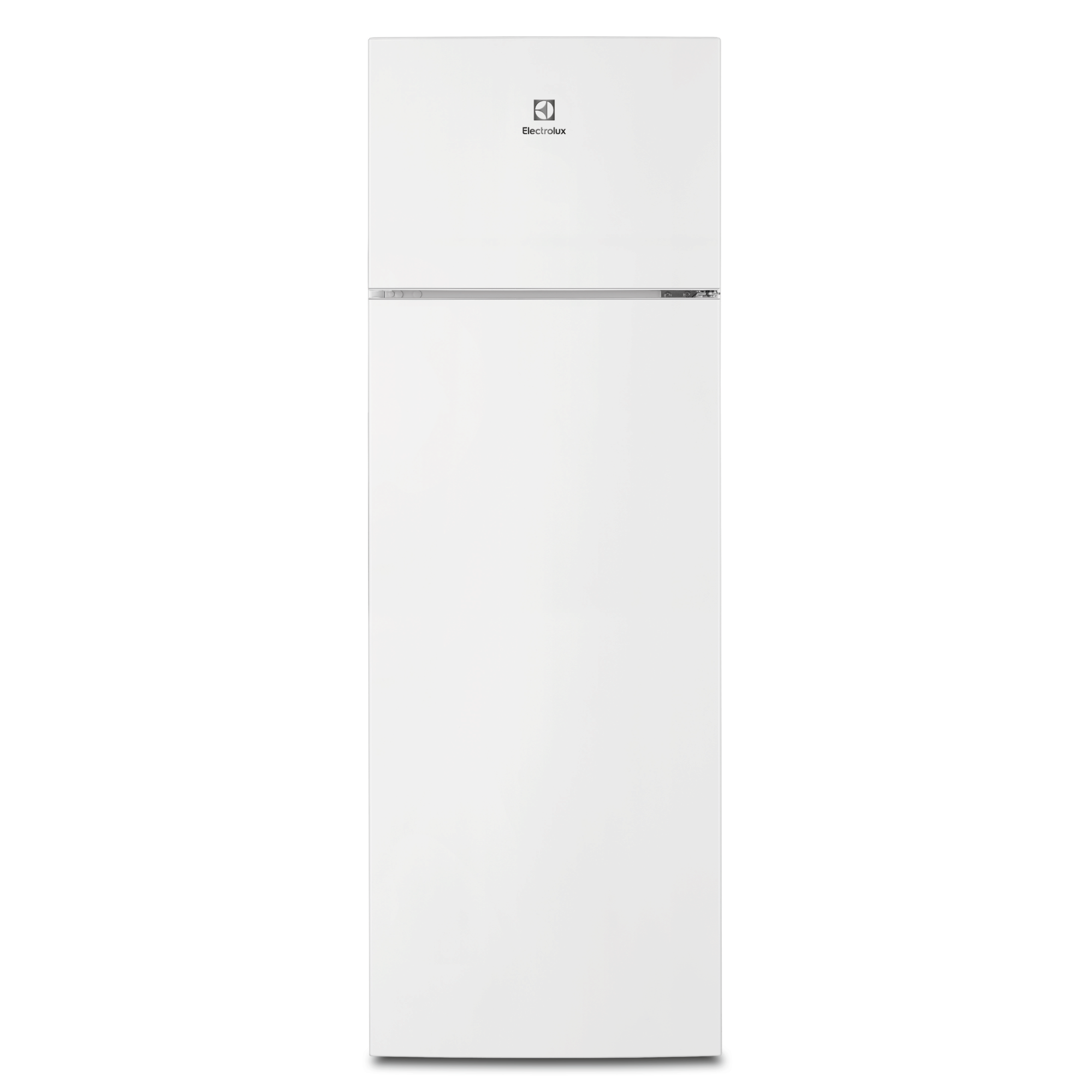 Lodówka z górnym zamrażalnikiem z technologią LowFrost, wyświetlaczem LCD i oświetleniem LED, kolor biały.