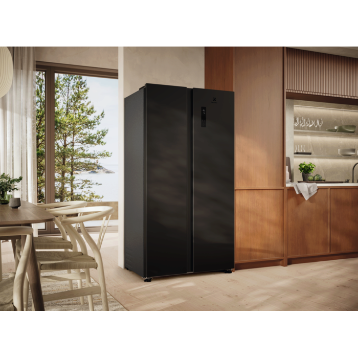 Lodówka 600 Cooling 360° Side by Side zapewnia równomierne chłodzenie na każdej półce, a system No Frost zapobiega powstawaniu szronu i eliminuje konieczność rozmrażania. Precyzyjna kontrola wilgotności pomaga dłużej zachować świeżość produktów, a intuicyjne sterowanie dotykowe i funkcja Fast Freeze gwarantują wygodę oraz skuteczne przechowywanie żywności każdego dnia.