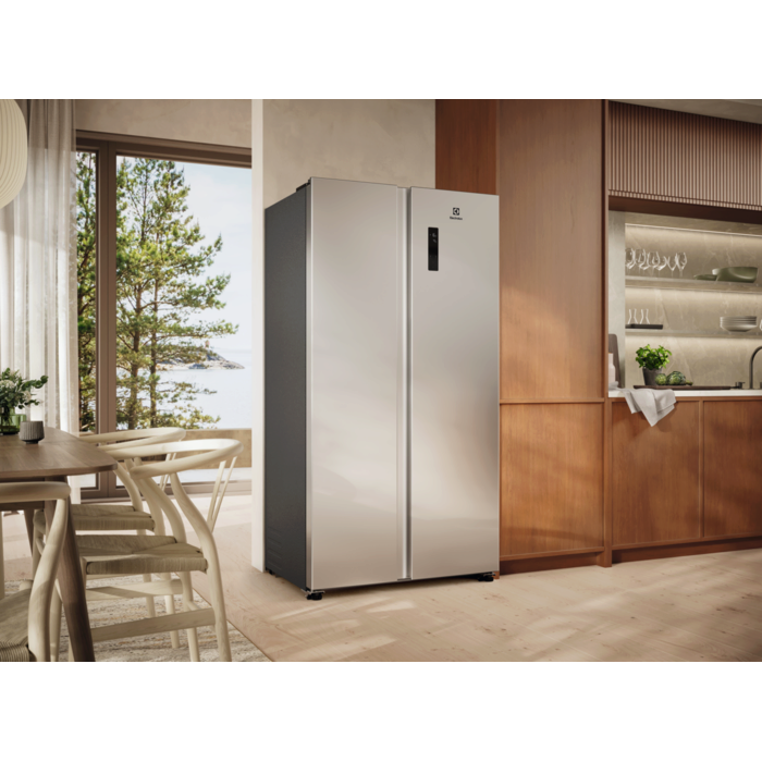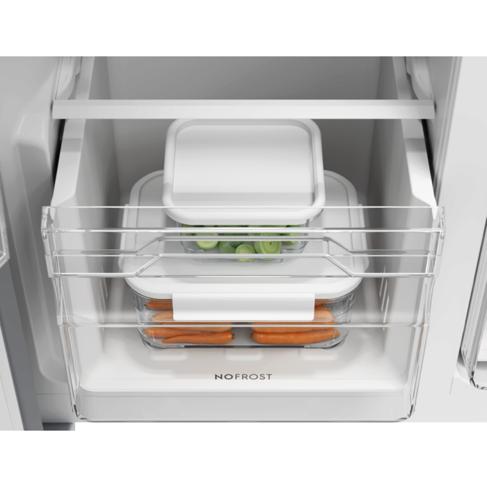 Lodówka 600 Cooling 360° Side by Side zapewnia równomierne chłodzenie na każdej półce, a system No Frost zapobiega powstawaniu szronu i eliminuje konieczność rozmrażania. Precyzyjna kontrola wilgotności pomaga dłużej zachować świeżość produktów, a intuicyjne sterowanie dotykowe i funkcja Fast Freeze gwarantują wygodę oraz skuteczne przechowywanie żywności każdego dnia.