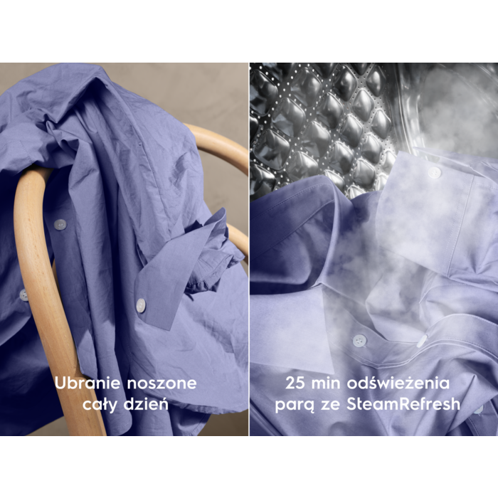 Pralko-suszarka 700 SteamCare umożliwia pranie, suszenie oraz odświeżanie ubrań parą w jednym urządzeniu. Dzięki niej możesz prać i suszyć nawet delikatne tkaniny, takie jak wełna, bez obaw o ich skurczenie. W przypadku, gdy pełne pranie nie jest konieczne, zastosuj parę, aby szybko odświeżyć odzież.