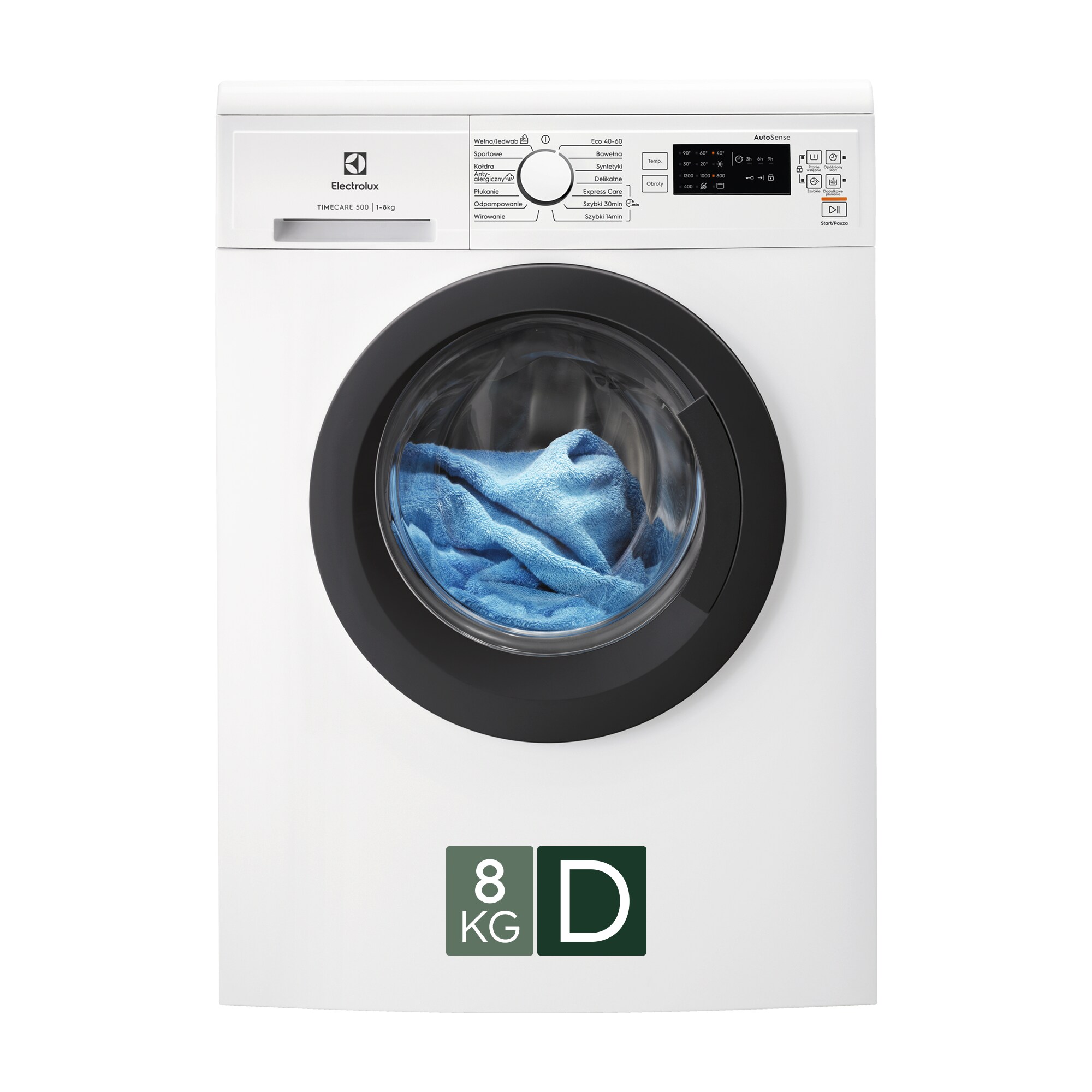 Pralka ładowana od frontu TimeCare 500 z systemem AutoSense i programem antyalergicznym, pojemność 8 kg.