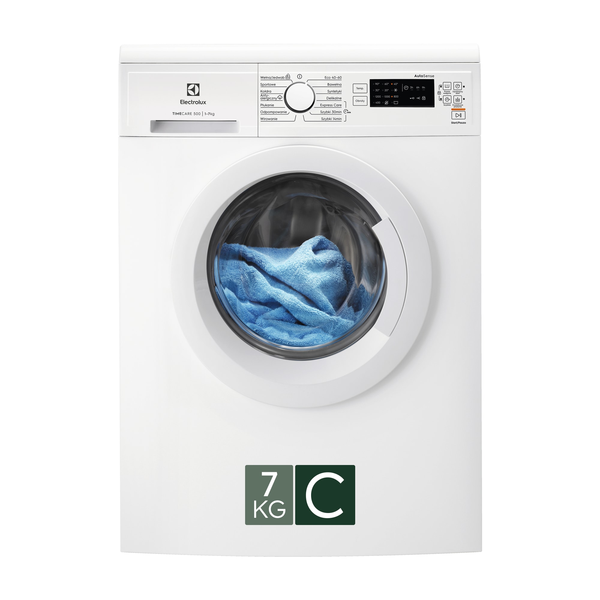 Pralka ładowana od frontu TimeCare 500 z programami AutoSense i Antyalergicznym oraz silnikiem inwerterowym, pojemność 7 kg.