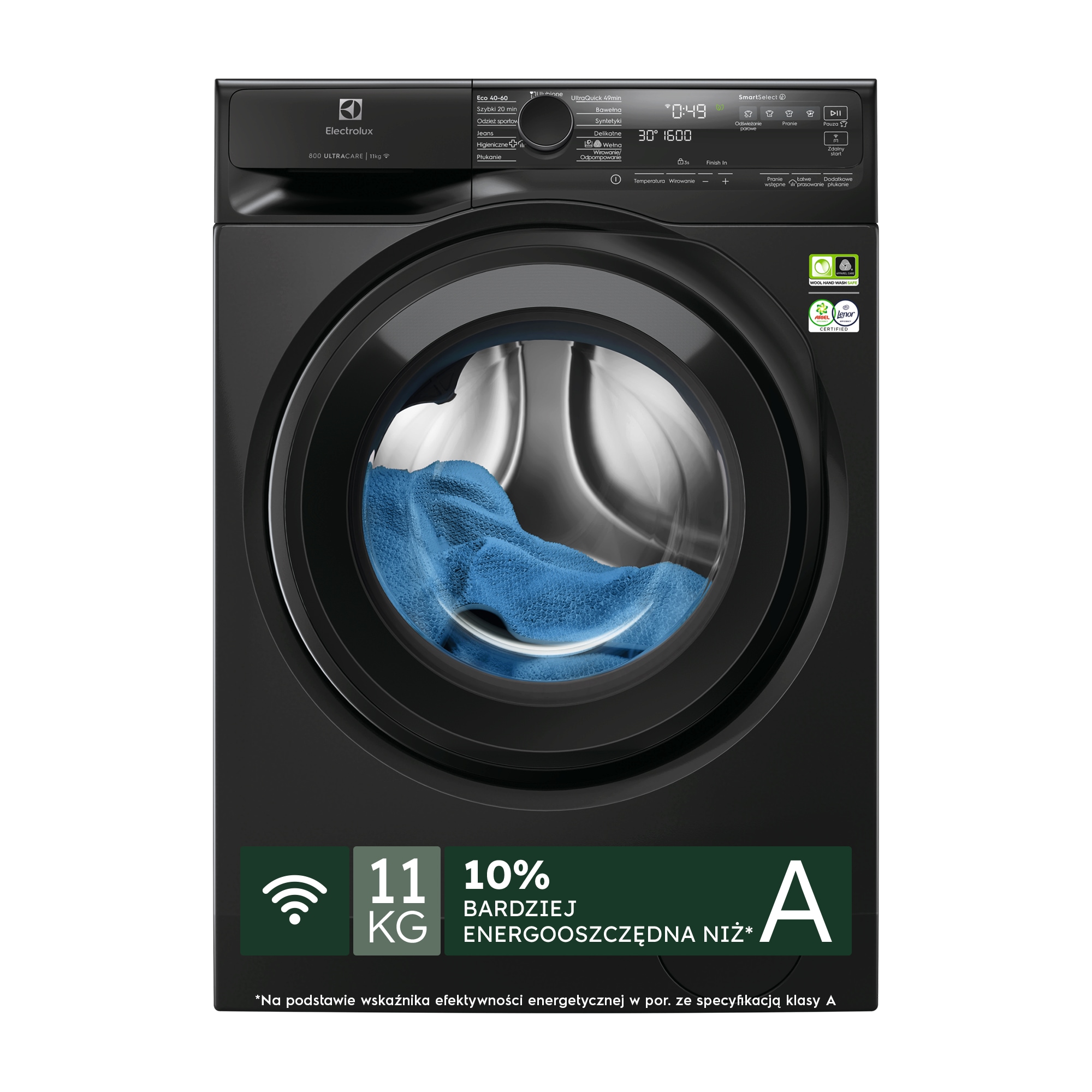*Na podstawie wewnętrznego testu porównującego zużycie energii podczas programu Bawełna 40°C z programem UltraQuick 49 minut w temperaturze 30°C. **Na podstawie zewnętrznego testu usuwania plam z 50 powszechnie występujących plam domowych przy użyciu programu UltraQuick 30°C z wsadem 5 kg.