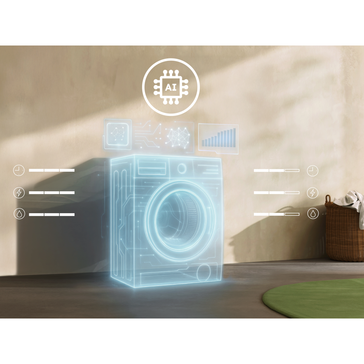 * Na podstawie algorytmu oceniającego ciężar ubrań, uczonego na dużej liczbie ładunków. Dane użytkowników nie zostaną wykorzystane do uczenia AI. ** Na podstawie wew. testu zużycia wody, energii i czasu przy wsadzie o wadze 1 kg, w por. do maks. wsadu w programie Bawełna 30°C z AI WashAssist i dostosowaniem programu do wielkości wsadu.