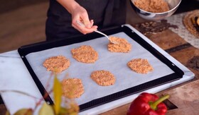 Wymieszaj wszystkie składniki. Uformuj 6 burgerów, ułóż na papierze do pieczenia i odstaw na 30 minut do wyschnięcia. Następnie włóż do piekarnika i piecz przez 20 minut w temperaturze 230°C.
