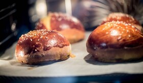 Rozpuść drożdże w 4 łyżkach ciepłego mleka i odstaw na 15 minut. Zagniataj makę, cukier, mleko i drożdże przez 5 minut. Dodaj posiekane masło, kurkumę i sól. Zagniataj przez kolejne 5 minut. Przykryj ciasto ściereczką i odstaw do wyrośnięcia na 30 minut. Uformuj 6 kulek, ponownie dostaw do wyrośnięcia na godzinę. Posmaruj bułki żółtkiem jajka i posyp sezamem. Piecz przez 18 minut (25% pary) w temperaturze 180°C.