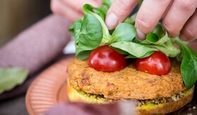 Burger: 265 g soczewicy gotowej do jedzenia / 180 g startej marchewki / ¼ czerwonej papryki / 6 suszonych pomidorów / sok z połowy z cytryny / pieprz / 4 łyżki octu winnego / 4 łyżki oliwy z oliwek / garść liści pietruszki / 1 jajko