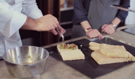 Na koniec dodaj oliwki, rodzynki i orzeszki pinii. Smaż przez 10 minut. Przełóż focaccię pysznym nadzieniem.