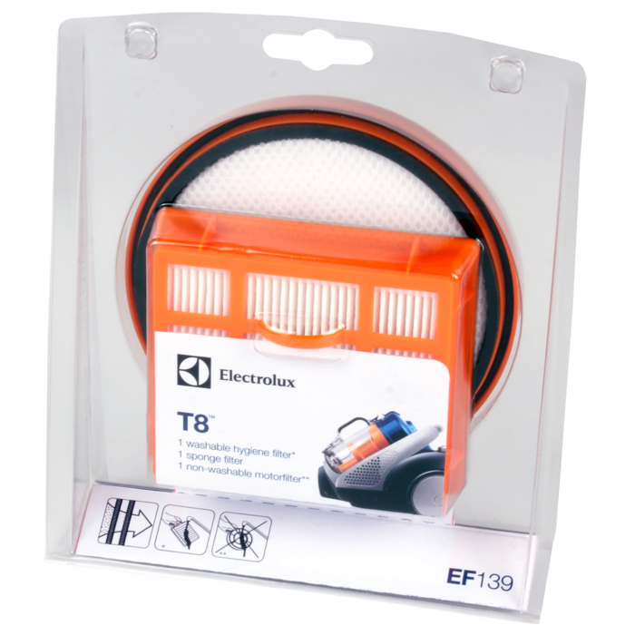 Wysokiej jakości filtry, zaprojektowane z myślą o bezworkowych odkurzaczach ELECTROLUX T8, zapewniają ich najlepszą wydajność. Filtry chronią silnik odkurzacza przed cząsteczkami kurzu znajdującymi się w pojemniku i zatrzymują kurz przed opuszczeniem odkurzacza. Zestaw zawiera filtr Hygiene, filtr gąbkowy i filtr silnika.