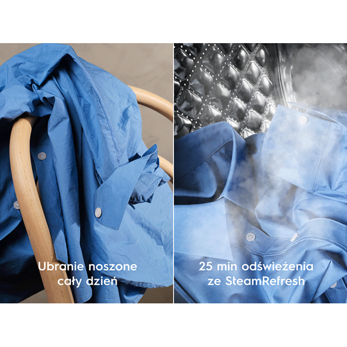 *Na podstawie wewnętrznego testu zużycia wody porównującego SteamRefresh z pełnym praniem w programie Delikatny 30°C przy wsadzie 1 kg *Na podstawie wewnętrznego testu porównującego zagniecenia na tkaninach w 100% z bawełny przed i po uruchomieniu SteamRefresh. **Na podstawie zewnętrznego testu, który porównuje zapach dymu papierosowego na tkaninach wykonanych w 100% z bawełny przed i po uruchomieniu cyklu SteamRefresh.