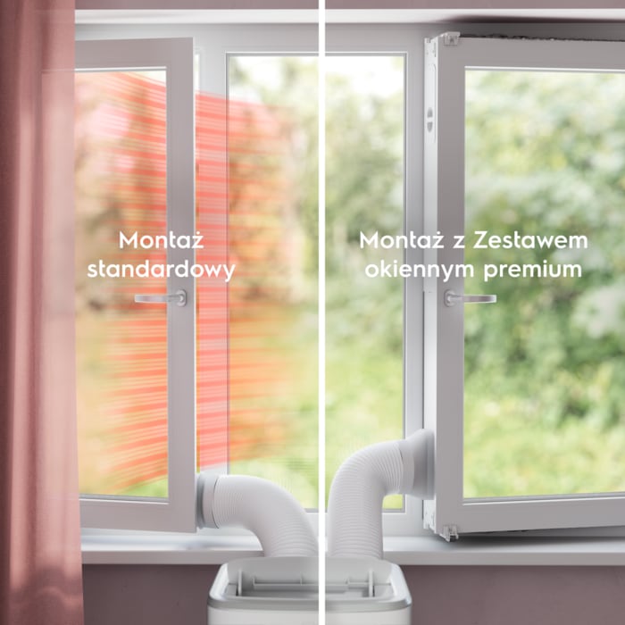 ²Gdy temperatura pomieszczenia wynosi 26°C, a zadana 20°C, wybór zestawu do okien Premium pozwoli zaoszczędzić do 28% energii w porównaniu z brakiem takiego zestawu. Wewnętrzny test w pomieszczeniu 14 m² przy wilgotności wzgl. 60% i temp. zewn. 30°C, w czasie 4 godz. 30 min.